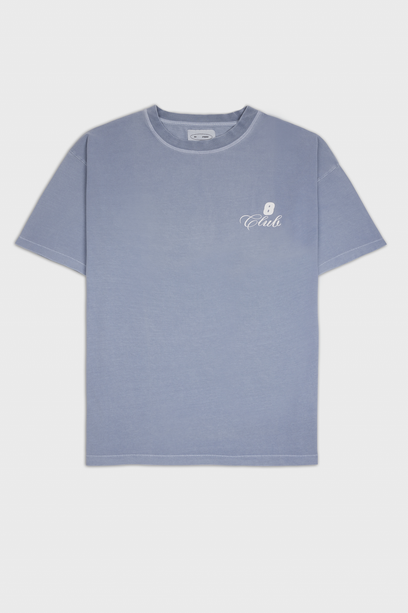 Camiseta oversize en azul claro con hombros caídos, 8 Club (colección club) en un lateral del pecho, la parte de atrás cuenta con un dibujo de color blanco y AGI STUDIOS CLUB.