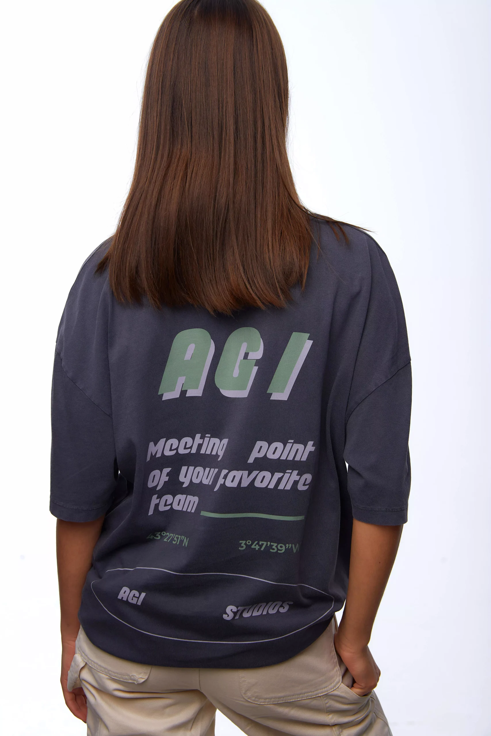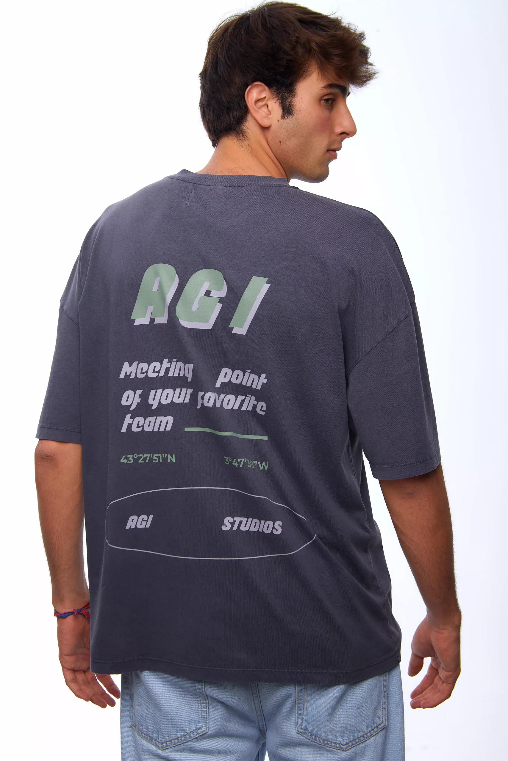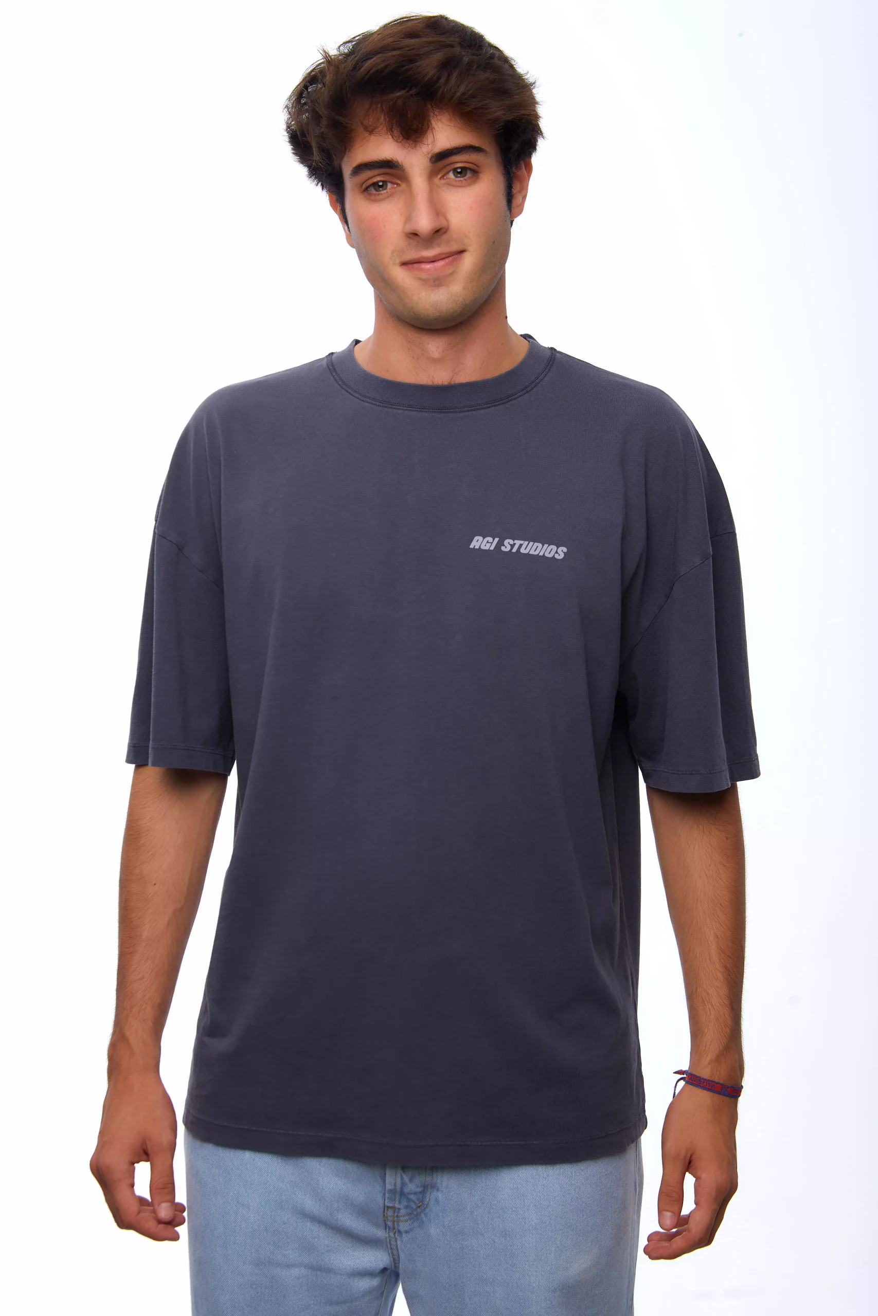 Camiseta oversize en azul grisáceo con hombros caídos. nuestro logotipo de AGI STUDIOS en un lateral del pecho en lilac marble y la parte trasera lo forman los colores lilac marble e iceberg green.