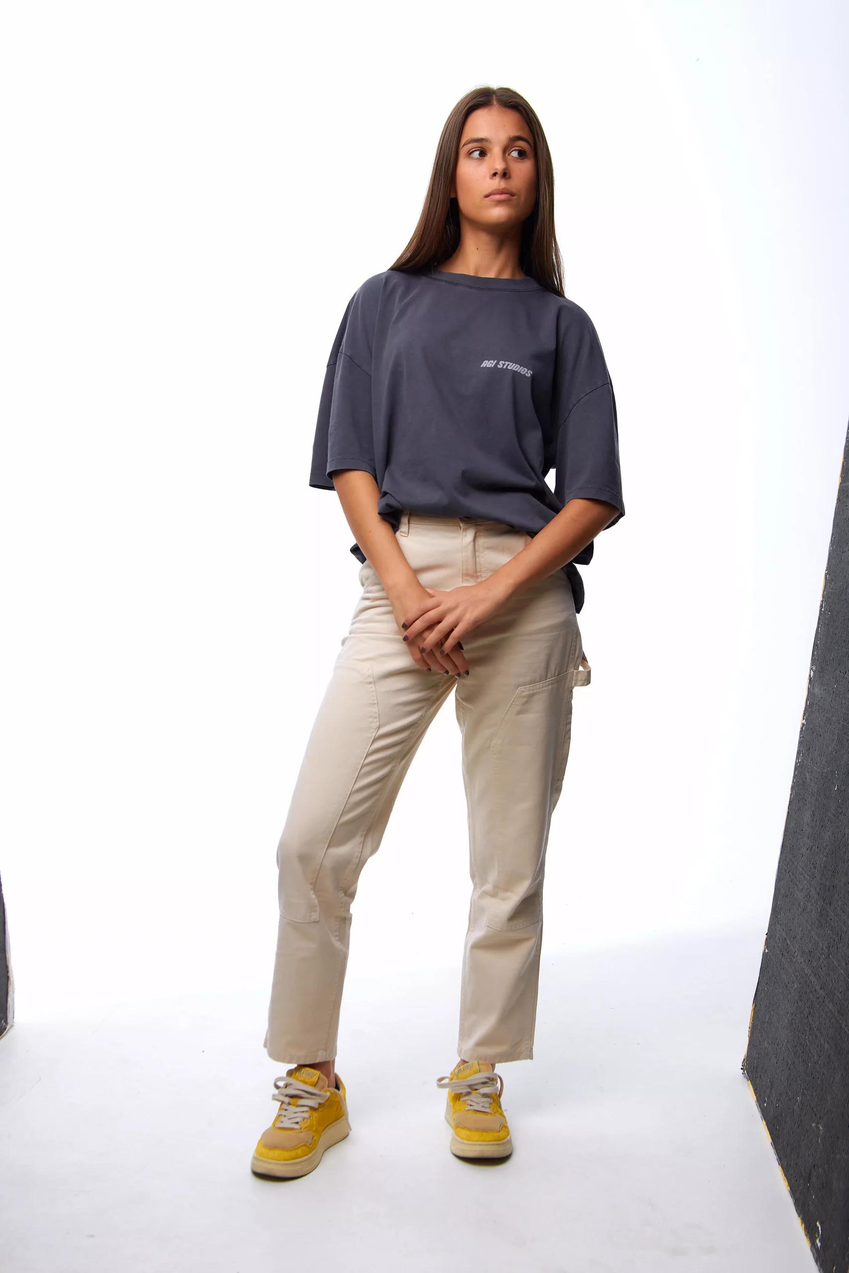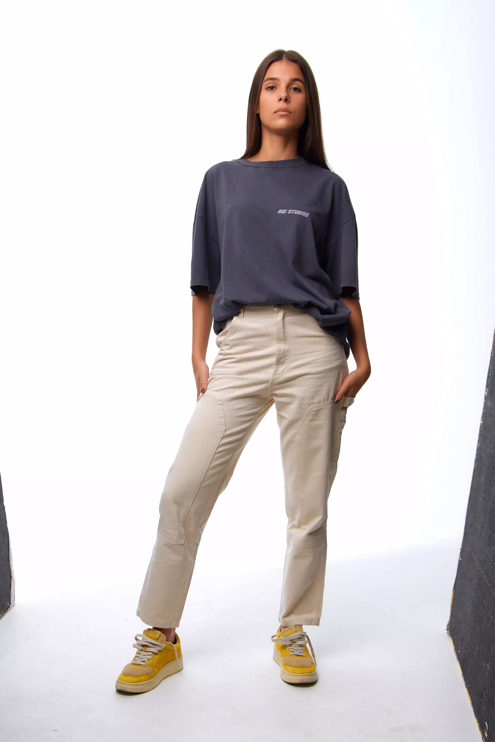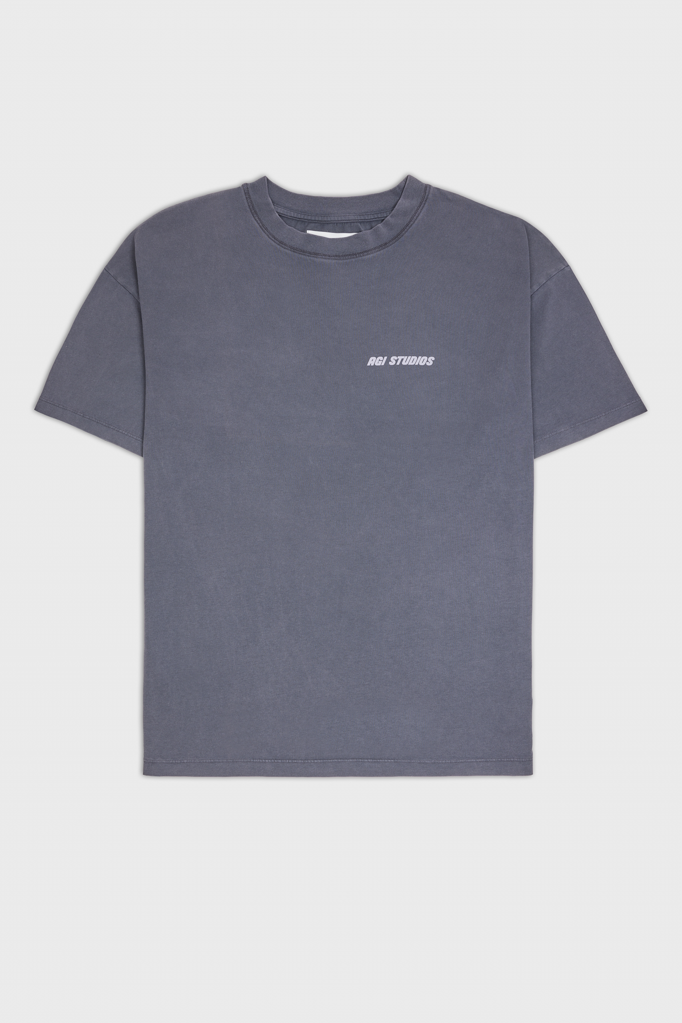 Camiseta oversize en azul grisáceo con hombros caídos. nuestro logotipo de AGI STUDIOS en un lateral del pecho en lilac marble y la parte trasera lo forman los colores lilac marble e iceberg green.