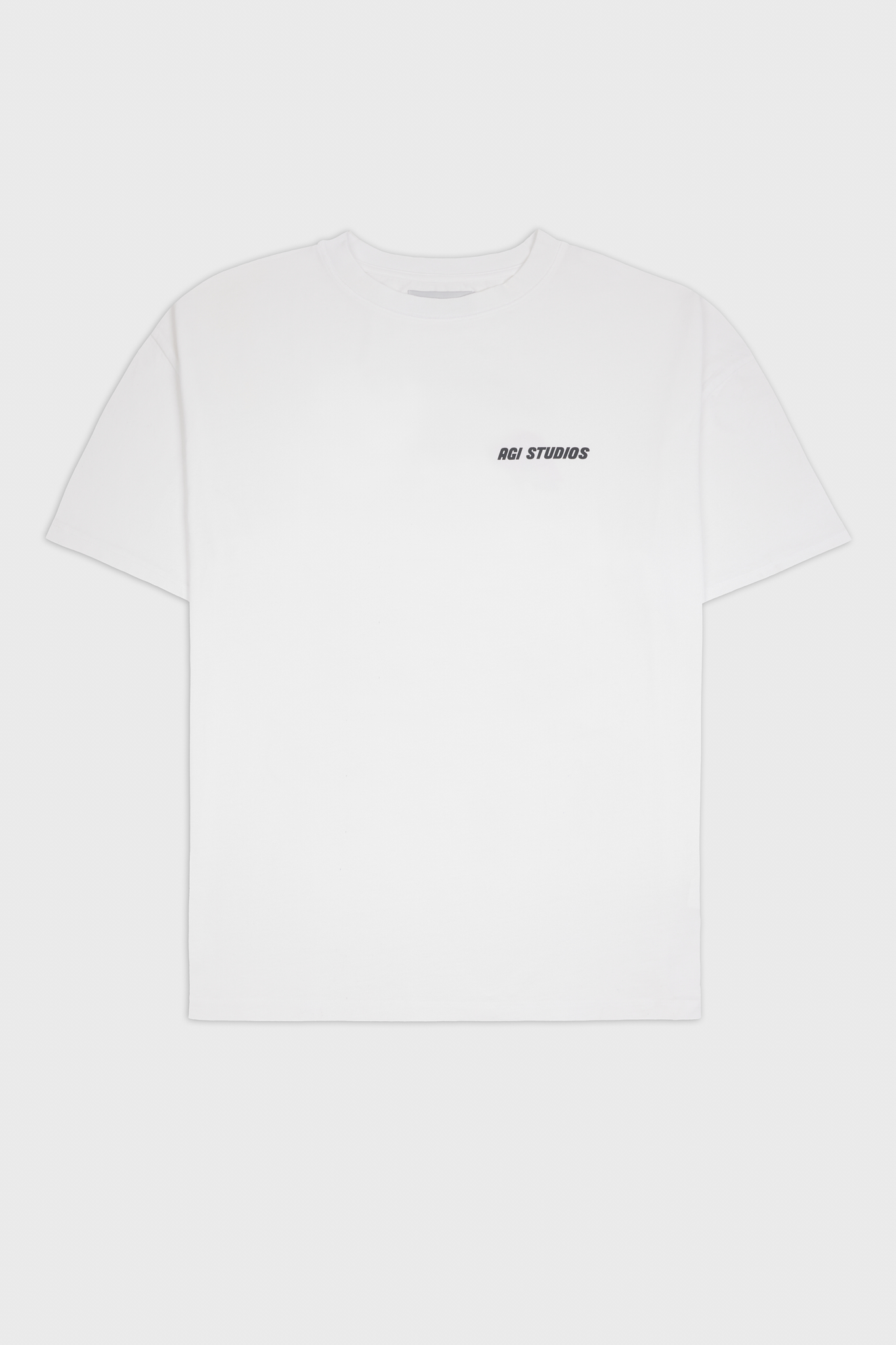 Camiseta oversize en blanco con hombros caídos, nuestro logotipo de AGI STUDIOS en un lateral del pecho en asphalt, la parte de atrás cuenta con los colores poppy red y asphalt