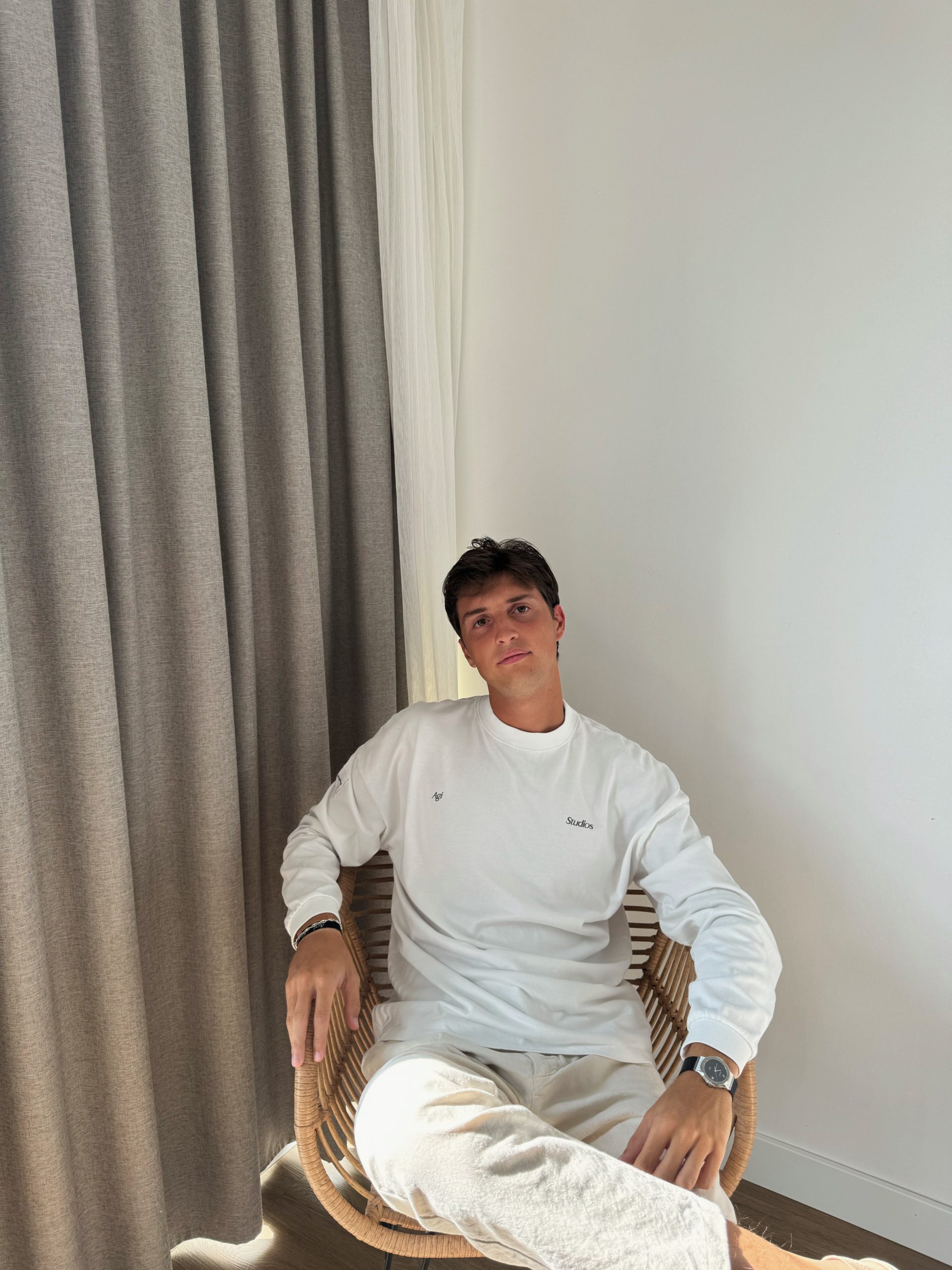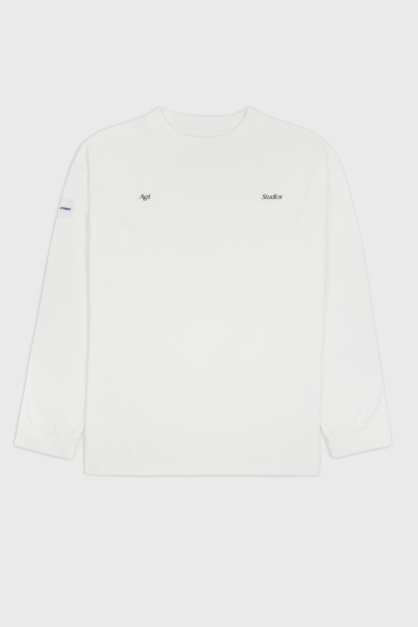 Camiseta oversize en blanco roto con hombros caídos unisex con letras negras en la parte delantera y de la misma forma en la parte trasera incluyendo un pequeño estampado en la manga derecha con la serigrafía de AGI STUDIOS.