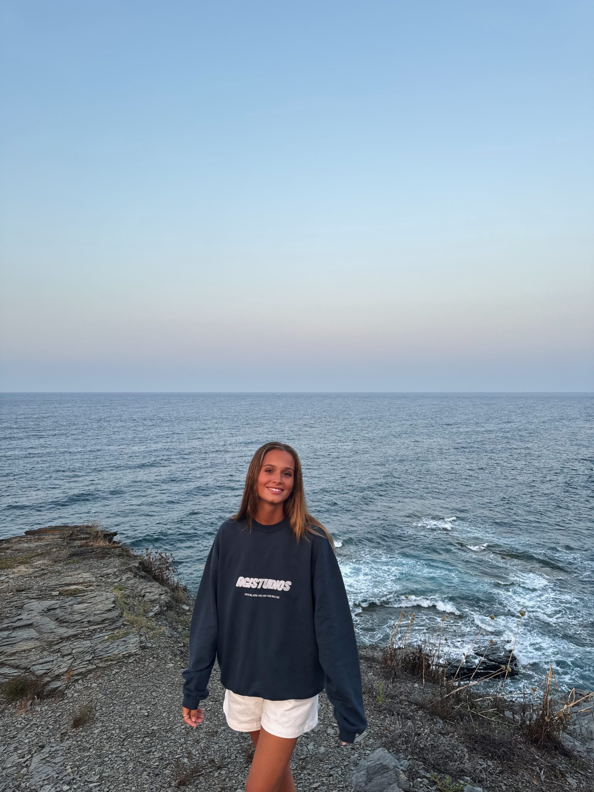 Sudadera oversize de cuello redondo en color azul marino, con logo de AGI STUDIOS (dream big…) en colores Gris claro y Blanco, bordado en la parte delantera, y 8 bordado de color Gris claro en la parte trasera.