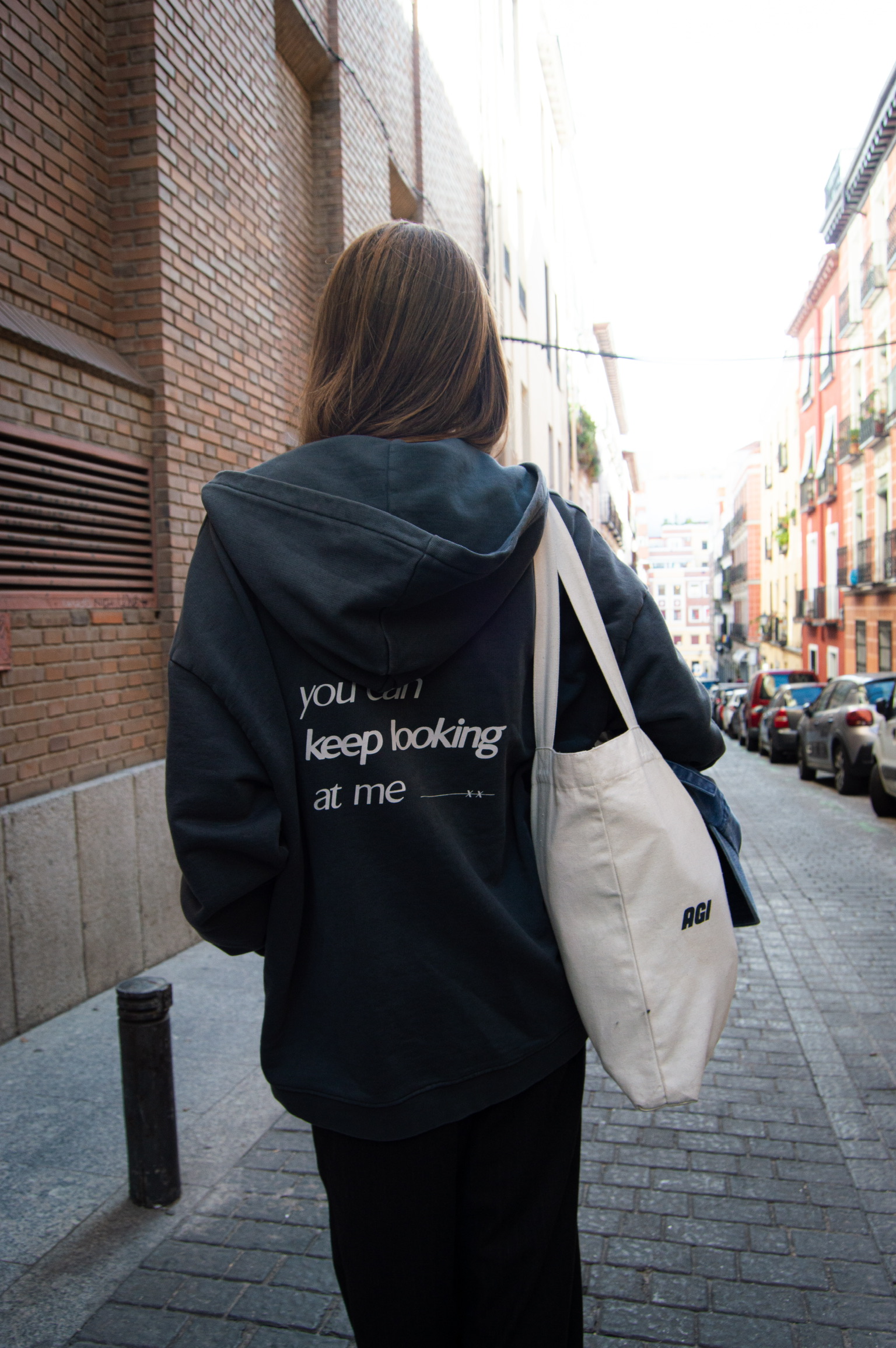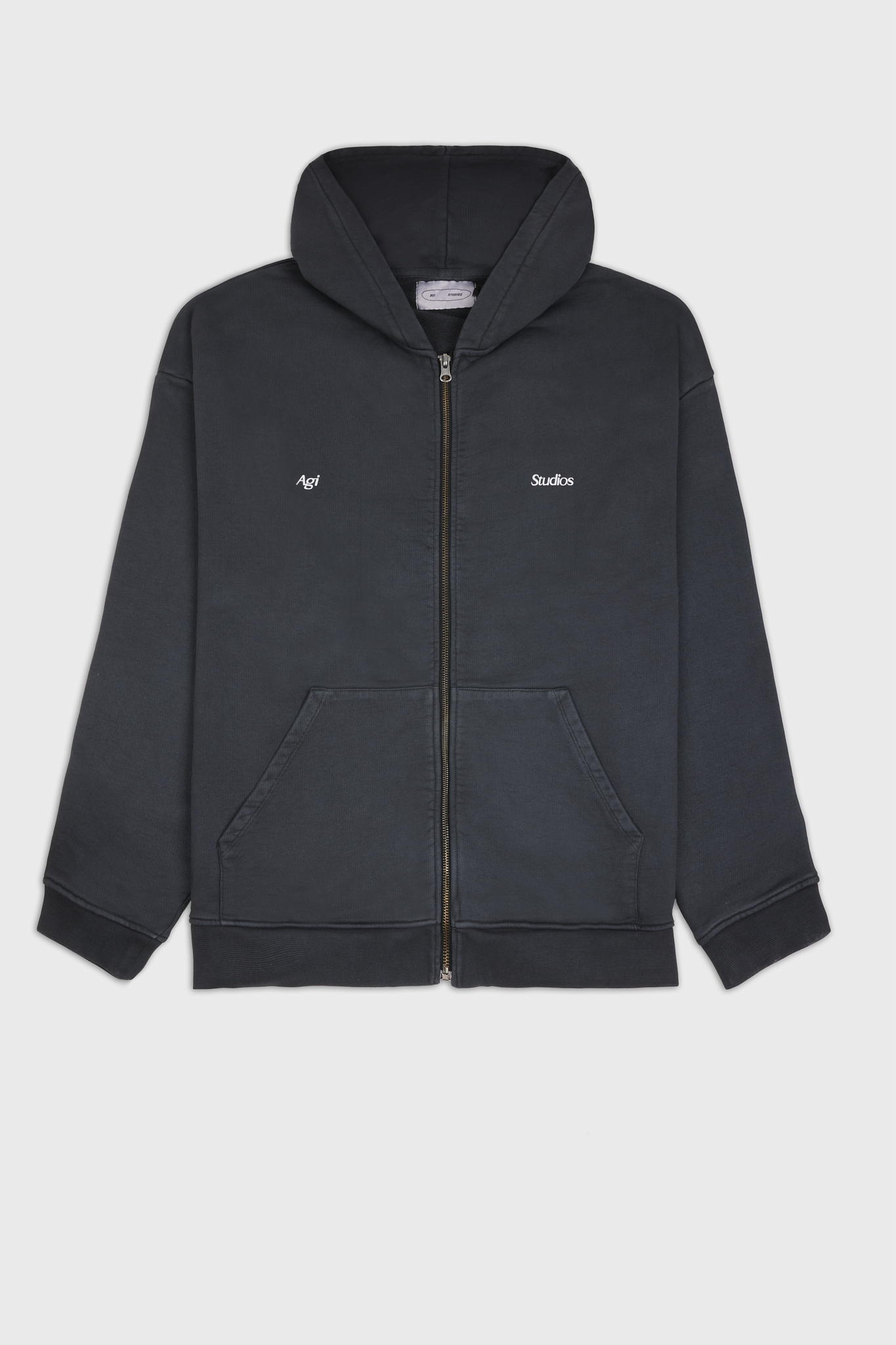 Sudadera de cremallera con capucha unisex en gris con letras blancas en la parte delantera y de la misma forma en la parte trasera incluyendo un pequeño estampado con la serigrafía de AGI STUDIOS.