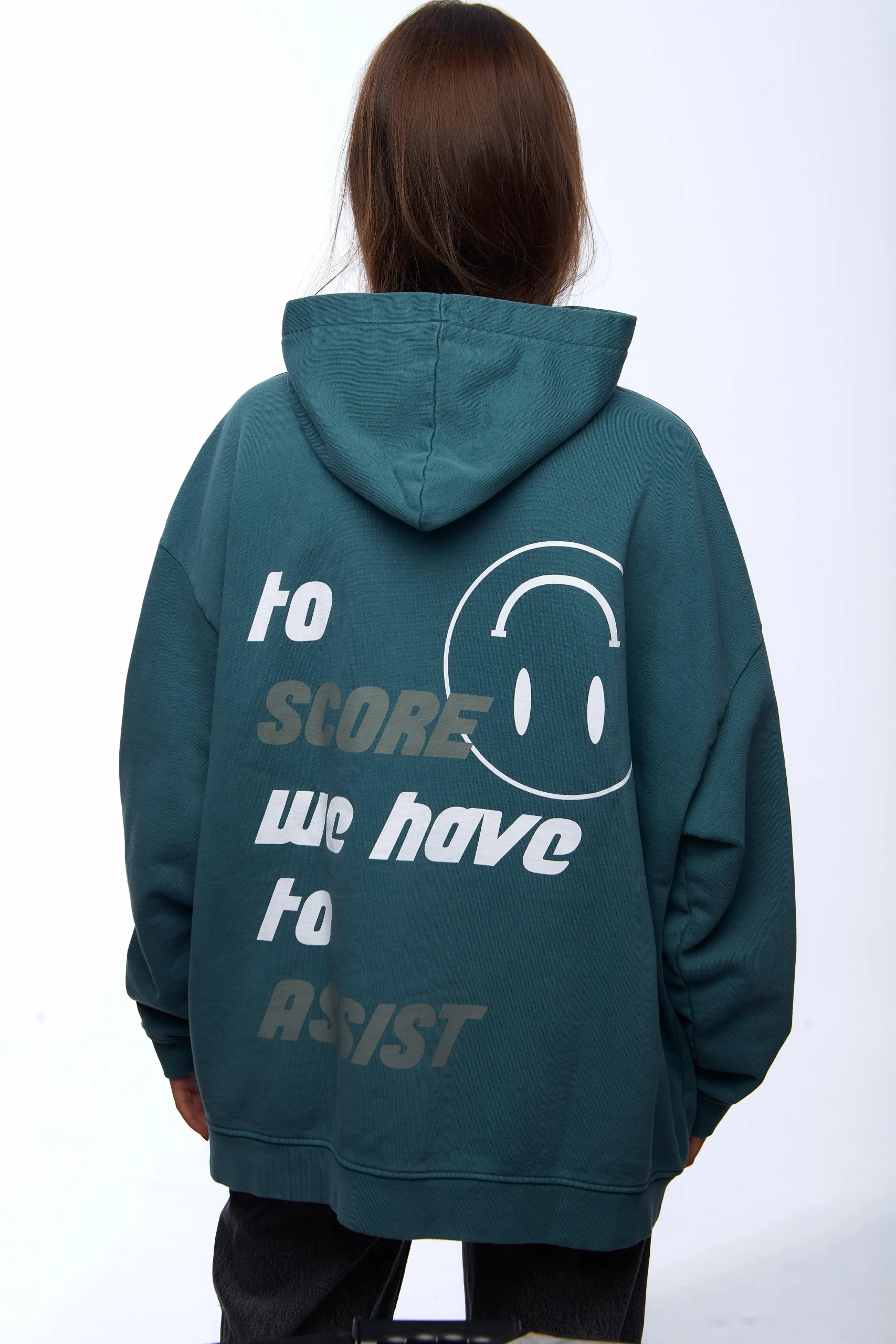 Sudadera con capucha unisex en verde con letras blancas en la parte delantera y gris con blanco en la parte trasera.